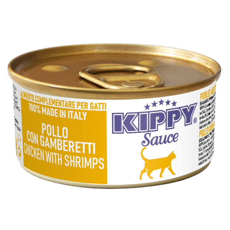 Aliment complémentaire pour chats, élaboré sous forme de délicieux effilochés en sauce au poulet et aux crevettes. Cette recette se caractérise par sa liste d'ingrédients courte, privilégiant des protéines de qualité, et sa forte teneur en humidité.