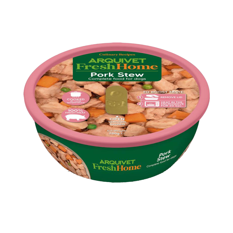 Le Ragoût de porc / FreshHome d'Arquivet est une nourriture humide complète pour chien, cuisinée comme à la maison, avec des ingrédients naturels de haute qualité.