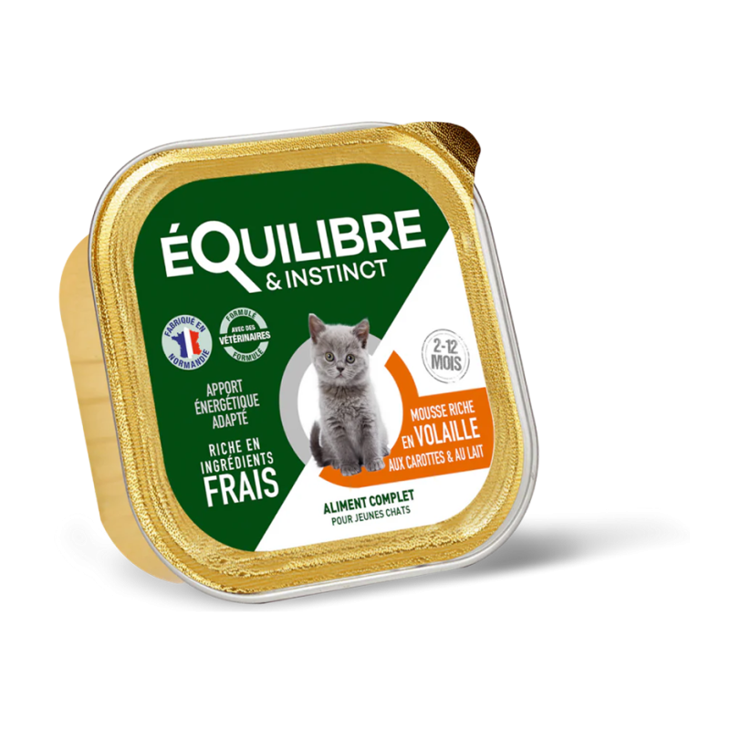 Équilibre & Instinct Mousse Chaton Volaille & Carottes est un aliment humide complet, formulé pour les chatons en croissance (du sevrage à 10-12 mois).