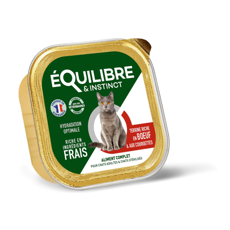 Équilibre & Instinct Pâtée Chat Stérilisé Bœuf & Courgettes est un aliment humide complet. Fabriqué en France, cette recette est formulée pour les chats adultes stérilisés.