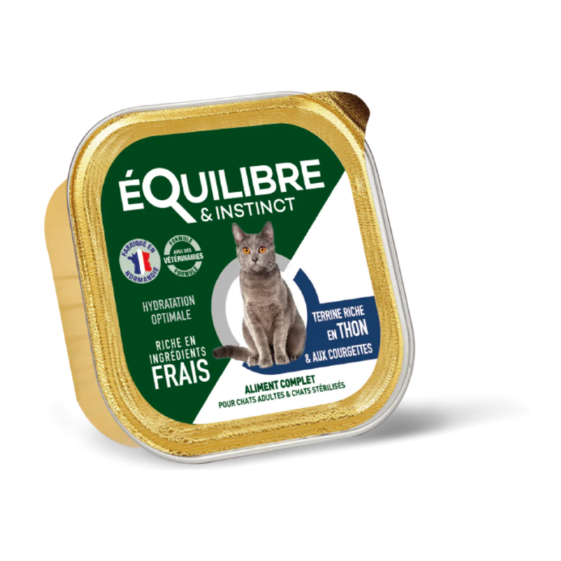 Équilibre & Instinct Pâtée Chat Stérilisé au Thon & Courgettes est un aliment humide complet sous forme de terrine, fabriqué en France et spécialement conçu pour les chats adultes stérilisés.