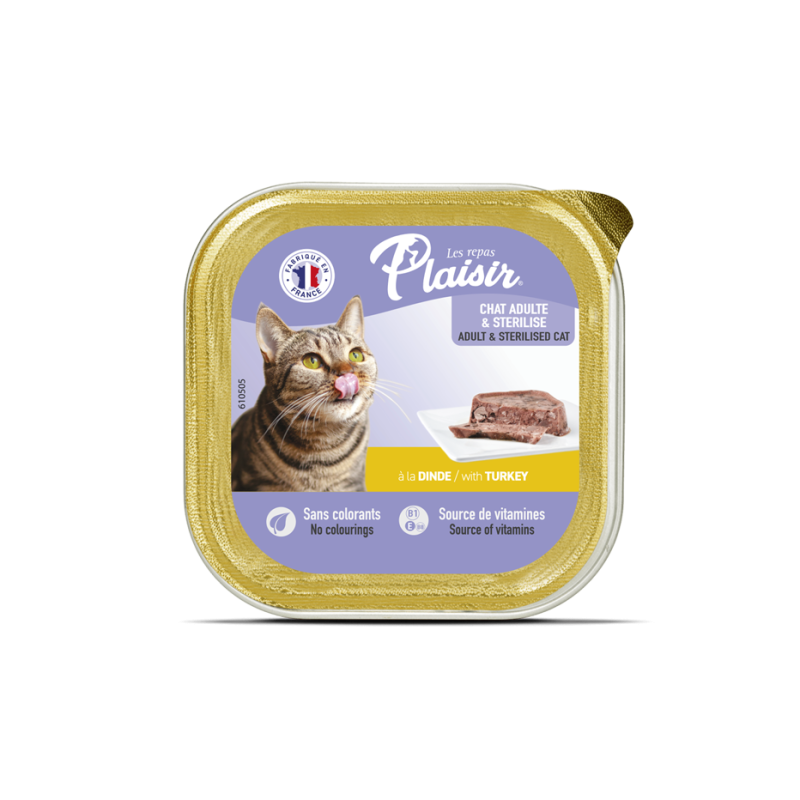 La Pâtée Chat Stérilisé Dinde & Courgettes des Repas Plaisir est un aliment humide complet, fabriqué en France et adapté aux chats adultes stérilisés.