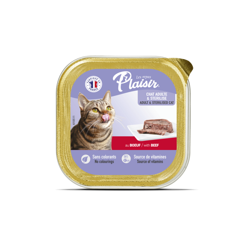 La Pâtée Chat Stérilisé au Bœuf des Repas Plaisir est une alimentation humide complète destinée aux chats adultes stérilisés. Sa texture de terrine se sert facilement au quotidien, en un ou plusieurs repas.