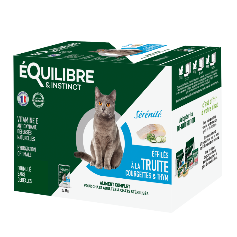 Équilibre & Instinct Effilés Chat Stérilisé à la Truite est un aliment humide complet sous forme de tendres effilés en sauce, formulé pour les chats adultes stérilisés. Fabriqué en France.