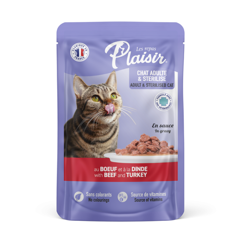 Émincés au Bœuf et à la Dinde en sauce de Les Repas Plaisir, un aliment humide complet et équilibré pour chat adulte stérilisé. Cette recette est formulée sans céréales pour une bonne digestibilité. Fabriqué en France.