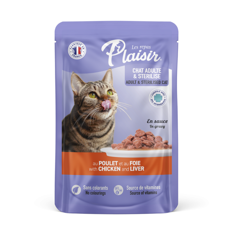 Émincés au Poulet et au Foie en sauce de Les Repas Plaisir, un aliment humide complet et équilibré pour chat adulte stérilisé. Cette recette est très appréciée et est formulée sans colorants ni conservateurs. Fabriqué en France.