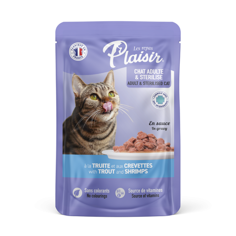 Émincés à la Truite et aux Crevettes en sauce de Les Repas Plaisir, un aliment humide complet et équilibré pour chat adulte stérilisé. Cette recette à base de poisson et de crustacés est formulée sans colorants ni conservateurs. Elle est enrichie en DL-Méthionine (2172 mg/kg) pour le soutien des voies urinaires, et présente une teneur élevée en humidité (82,0 %) pour favoriser l'hydratation. Ce sachet fraîcheur de 100g est fabriqué en France.