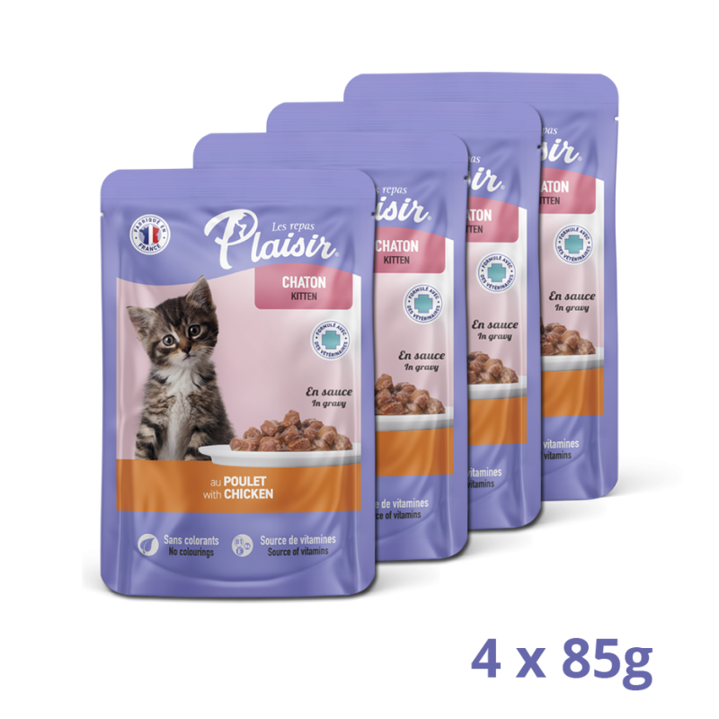 Pack découverte d'Émincés au Poulet en sauce de Les Repas Plaisir, un aliment humide complet et équilibré spécialement conçu pour les chatons. Ce format permet de tester une alimentation de qualité, formulée sans céréales, sans colorants ni conservateurs, et riche en vitamines B1, B6 et E pour soutenir la croissance. Le pack contient 4 sachets fraîcheur de 100g. Ce produit est fabriqué en France.