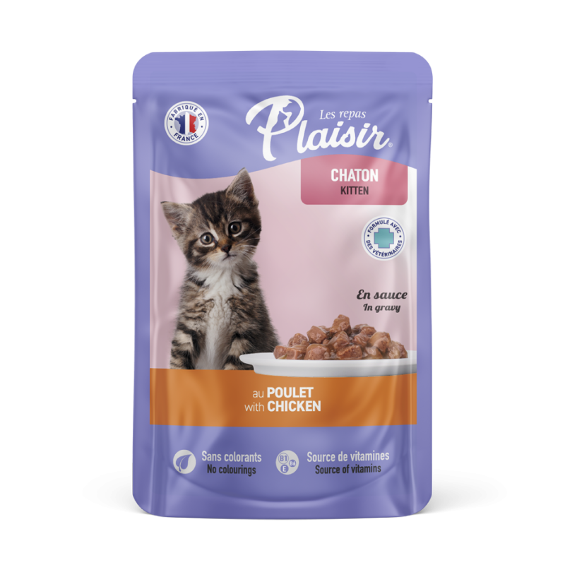 Émincés au Poulet en sauce de Les Repas Plaisir, un aliment humide complet de 100g spécialement formulé pour les chatons en croissance. Produit fabriqué en France.