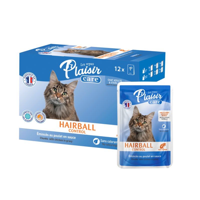 Aliment humide complet et équilibré en sachets fraîcheur de 85g, spécialement élaboré pour soutenir le transit intestinal du chat et faciliter l’élimination naturelle des boules de poils.
