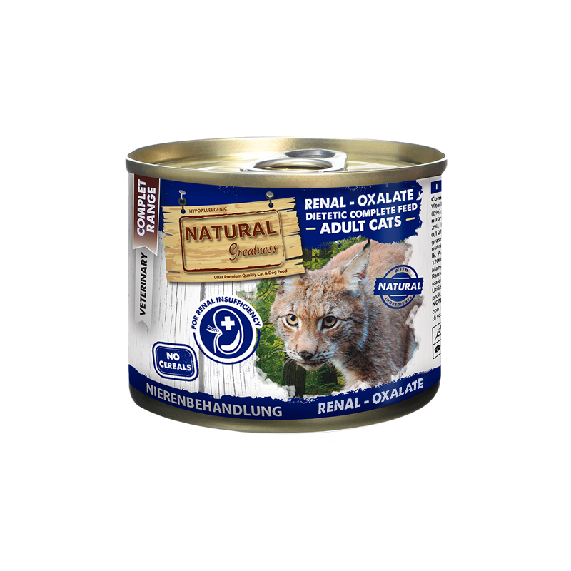 Oxalate rénal Natural Greatness est un aliment humide complet, hypoallergénique et sans céréales, formulé pour les chats adultes atteints d'insuffisance rénale chronique (IRC) problèmes qui nécessitent un alimentation avec un apport limité en protéines et en phosphore. Les soins rénaux contribuent à la préservation de la fonction rénale et la réduction de la récidive des calculs d'oxalate.