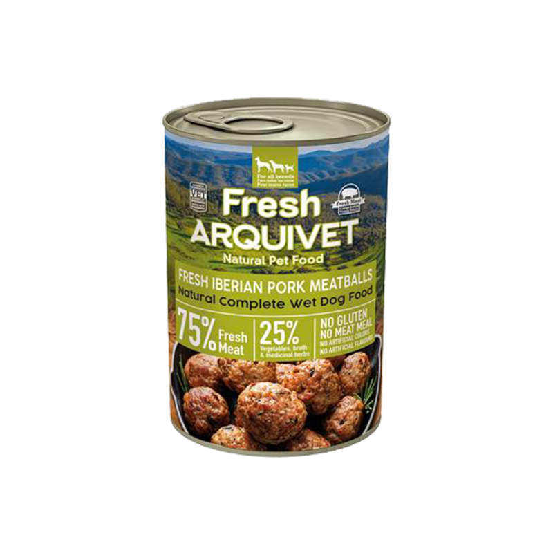 Aliment complet humide pour chien adulte. Boulettes au porc ibérique, poulet et pommes, sans céréales, avec 75% de viande/poisson.