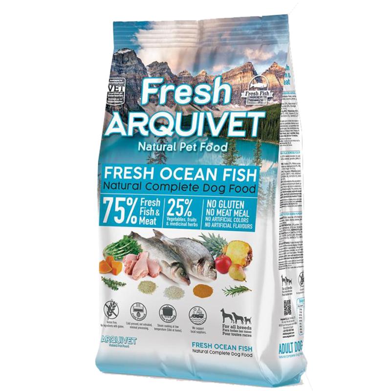 Cette recette Arquivet Fresh Ocean Fish associe 55 % de poissons frais de mer et 20 % de poulet frais, complétés par des légumes, fruits et plantes. La fabrication pressée à froid, la cuisson lente et la texture semi-humide en font une recette appréciée des chiens adultes. Sans gluten, sans farine de viande, sans colorants ni arômes artificiels.
