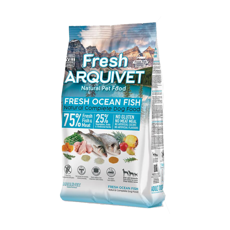 Cette recette Arquivet Fresh Ocean Fish associe 55 % de poissons frais de mer et 20 % de poulet frais, complétés par des légumes, fruits et plantes. La fabrication pressée à froid, la cuisson lente et la texture semi-humide en font une recette appréciée des chiens adultes. Sans gluten, sans farine de viande, sans colorants ni arômes artificiels.