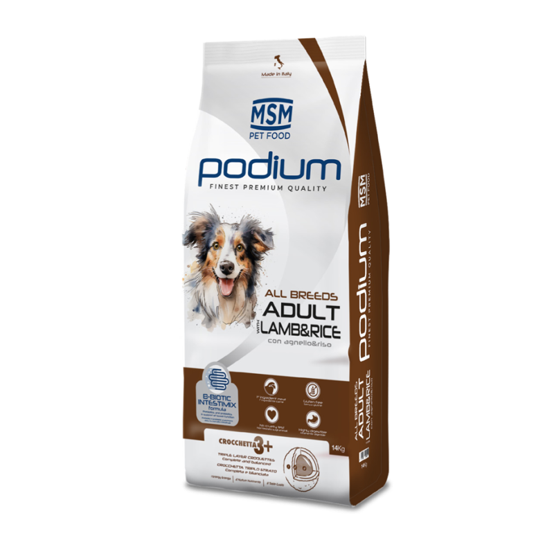 Podium Adult Lamb & Rice est un aliment complet pour chiens adultes, élaboré à partir de protéines animales transformées, d’agneau et de riz. Sa formulation inclut le complexe prébiotique B-Biotic Intestimix, ainsi que des céréales extrudées et des ingrédients sélectionnés pour une alimentation quotidienne sans gluten.