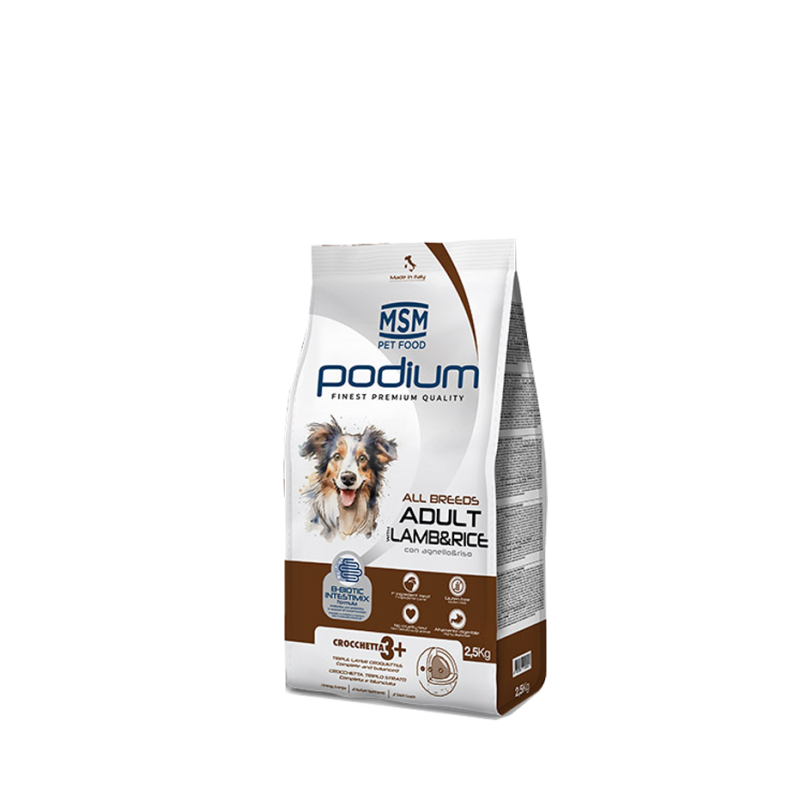Podium Adult Lamb & Rice est un aliment complet pour chiens adultes, élaboré à partir de protéines animales transformées, d’agneau et de riz. Sa formulation inclut le complexe prébiotique B-Biotic Intestimix, ainsi que des céréales extrudées et des ingrédients sélectionnés pour une alimentation quotidienne sans gluten.