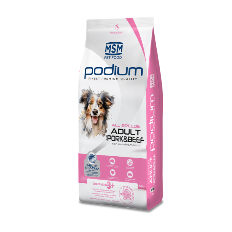 Podium Adult Pork & Beef est une recette complète à base de porc et de bœuf, enrichie en prébiotiques et probiotiques. Sans gluten et élaborée pour offrir une bonne appétence, elle constitue une option adaptée pour de nombreux chiens adultes.