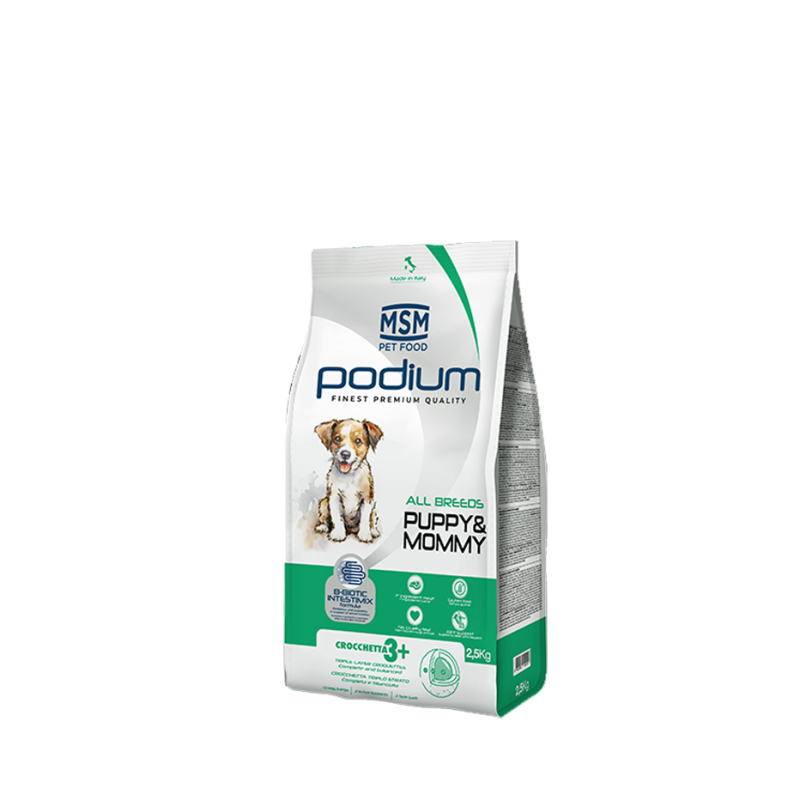 Podium Puppy & Mommy est une recette complète combinant protéines animales, prébiotiques, probiotiques et un apport adapté pour accompagner la croissance des chiots ainsi que les besoins des femelles gestantes et allaitantes. Sans gluten, elle peut être utilisée comme alimentation quotidienne.