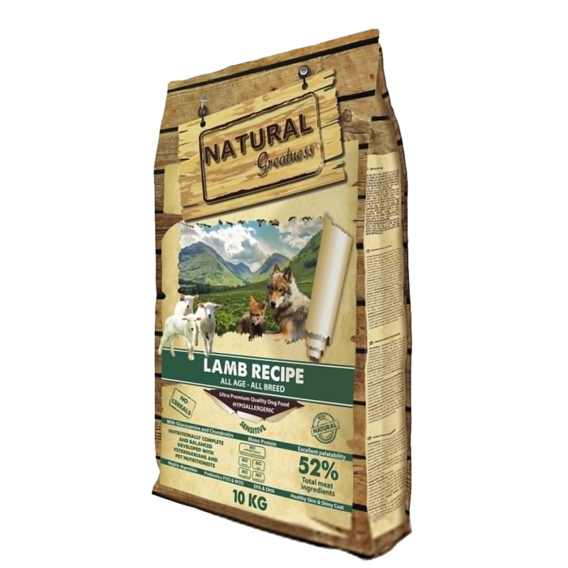 Natural Greatness Lamb Recipe met en avant l’agneau (frais et déshydraté), associé à des légumes, fruits, prébiotiques (FOS, MOS) et à un apport en glucosamine et chondroïtine. La présence d’huile de saumon et de graines de lin apporte des acides gras oméga 3, pour une alimentation quotidienne complète.