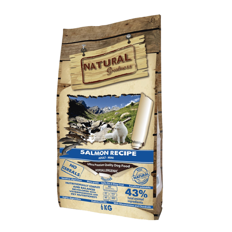 La recette Natural Greatness « Recette au saumon - Mini » met en avant le saumon (déshydraté et frais) associé à la pomme de terre comme source d’énergie. L’absence de céréales, la présence d’acides gras oméga 3 et 6, ainsi que l’ajout de chicorée, MOS et levures sont des caractéristiques de cette formule pour chiens adultes de petite taille. Elle peut être utilisée comme aliment complet quotidien en respectant les rations recommandées.