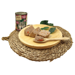Pâtée complémentaire ultra premium associant lapin et cerf, deux viandes nobles hypoallergéniques, avec carottes, olives et amarante pour un profil nutritionnel complet et naturel.