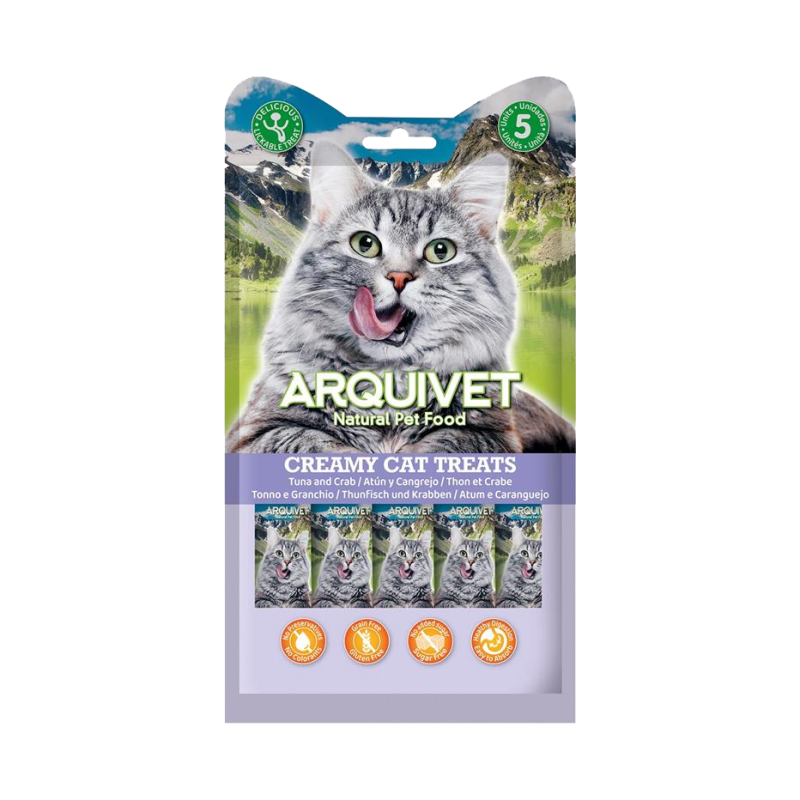 Les Snacks crémeux Thon & Crabe d'Arquivet sont des friandises liquides irrésistibles, riches en viande et poisson, conçues pour offrir une expérience gustative unique à votre félin tout en contribuant à son hydratation.